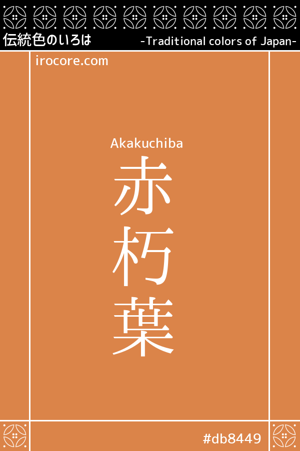 The Akakuchiba, it is a red brown russet brown reddish. Color name is from the Heian period, arranged "table Kay red weft washed yellow, yellow-back" for the color of the raid, is the color that represents the color of decayed leaves that colored red late in the fall. It is similar to the "russet brown", but it is gorgeous things from it in the color score. I have seen clothes of "red decayed leaves" and "... the upcoming red decayed leaves of thin," "weathervane from decayed leaves of red" and "Fu Kagero Diary" and "Tale of Genji".