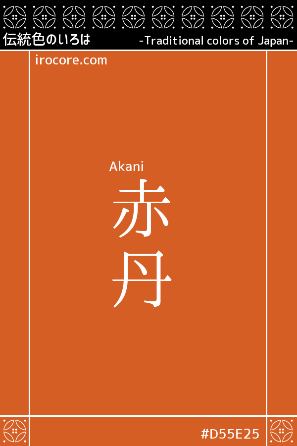 The Akadani is an austere red color with a yellowish tinge, made from red clay as pigment. It is an old color name that can be found in the Heian period (794-1185), and is also written as "赤土" or "赭土".