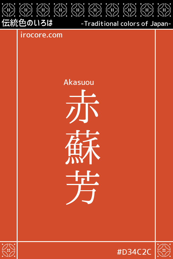 Akasuo (赤蘇芳) refers to a subdued red color with a hint of vermilion. It is one of the dye colors derived from suō-zome (蘇芳染, sappanwood dyeing). When baisenzai (媒染剤, mordant) such as myōban (明礬, alum) is used instead of aku (灰汁, wood ash) in the dyeing process, the resulting color becomes more vermilion-toned than the usual suō-iro (蘇芳色, suō color). Due to this characteristic, the name "Akasuo" (Red Suō) became established as a distinct color name.