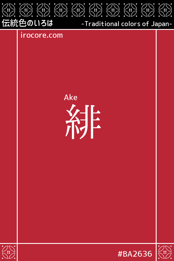 The Ake, by a bright red with a yellowish somewhat, it is a traditional color name that was used since the Heian period. The dye and the roots of madder perennial native to Yamano, was mordant in lye. It is the color of fire and day of the color name "open". It was positioned fifth in the 19 colors in the high and low clothing that since the days of Empress Suiko, it becomes the color of the high-level second only to purple, as defined in the Nara period. Dyeing method changes from the middle of the Heian period, the brilliant Beniake-iro, color was also a "scarlet" is also how to read it along with it. In general, it is the image of the "bright red" image of "a little dark red", the Ake-iro and Akane-iro if you want to distinguish each.