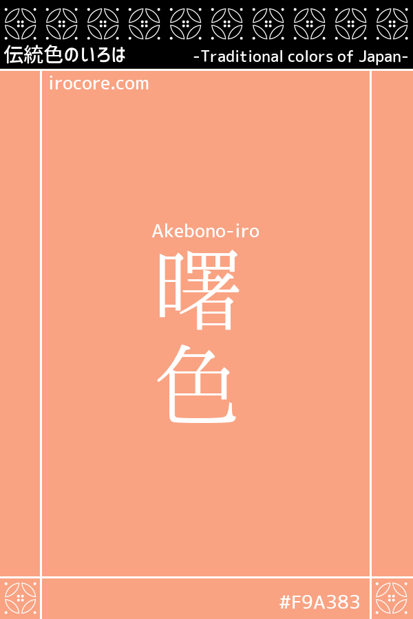 曙色(あけぼのいろ)とは、曙の空を思わせる、朝焼けのような淡い黄赤色です。「東雲色」ともいいます。江戸時代前期に、裾を白くし、上部を紅や紫などでぼかしていく「曙染」が流行しました。英語色名のオーロラ(英語: aurora/英語: auroral)と同一の色です。