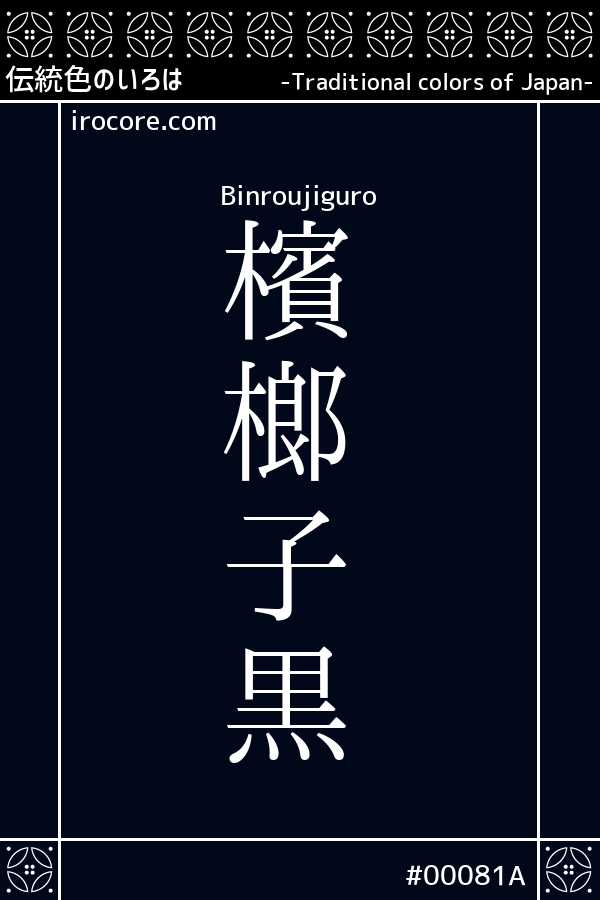 檳榔子黒(びんろうじぐろ)とは、青みを含んだ気品のある黒色のことで『檳榔子染 』の別名もあります。檳榔子黒は、藍を下染めに檳榔樹 の実「檳榔子 」で染められた最高級の黒染の色であり、藍を下染めにすることから『藍下黒 』とも呼ばれました。また、紋付きの最高級の色とされています。