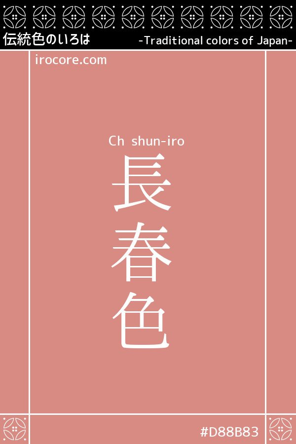 長春色(ちょうしゅんいろ)とは、灰色がかった鈍い紅色のことです。長春とは本来は常春 の意味ですが、古く中国から渡来した「庚申薔薇」の漢名「長春花」からきており、この薔薇の花が色名の由来です。 この色が流行したのは大正時代のことで、落ち着いた色合いから女性たちの人気を集めました。英名では「オールドローズ」とも。