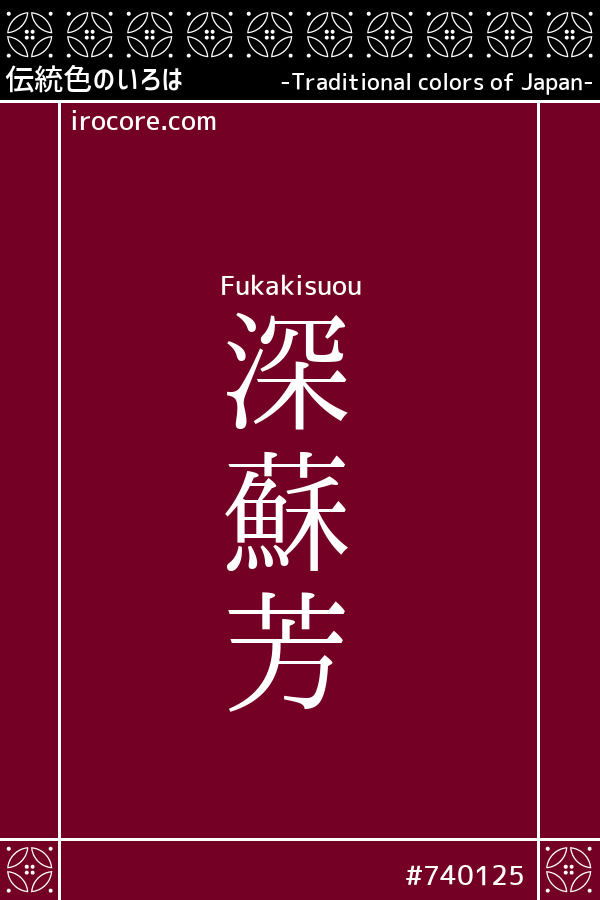The Fukakisuoho is a dark, austere crimson color with a deep suoho tint. It is an ancient color name, and is also read as "Fukasuoh" or "Kokisuoh. The name was given to the darkly dyed "Suou-iro" by adding "Fukasuou," meaning "dark.