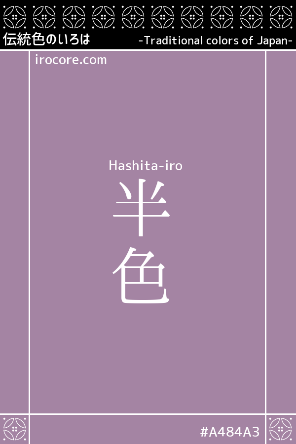 The Hashita-iro is a light austere crimson-purple color. Hashita-iro" means an intermediate color that deviates from the norm, or a halfway color, and was also written as "端色" (meaning "edge color"). It is an old color name that can be found in Heian literature, and was originally derived from an ancient dye color.