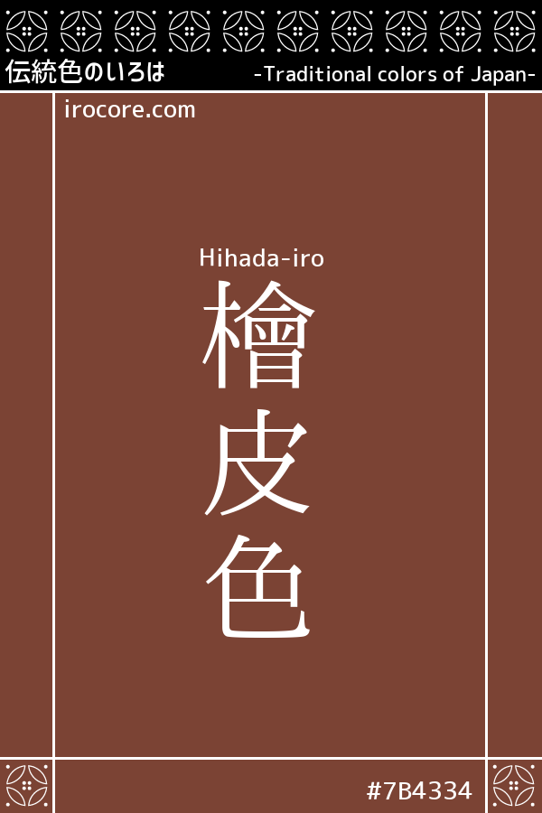 The Hihada-iro, the name of the dye. It is a sappanwood color blackish. It is said also was a color of stain that dyed in the bark of cypress first, but refers to the red brown to dark like the bark of cypress in general. It seemed color names that are well known already to the Heian period, such as "hakama of Hihada-iro" and "paper of Hihada-iro" has appeared in the "Tale of Genji".