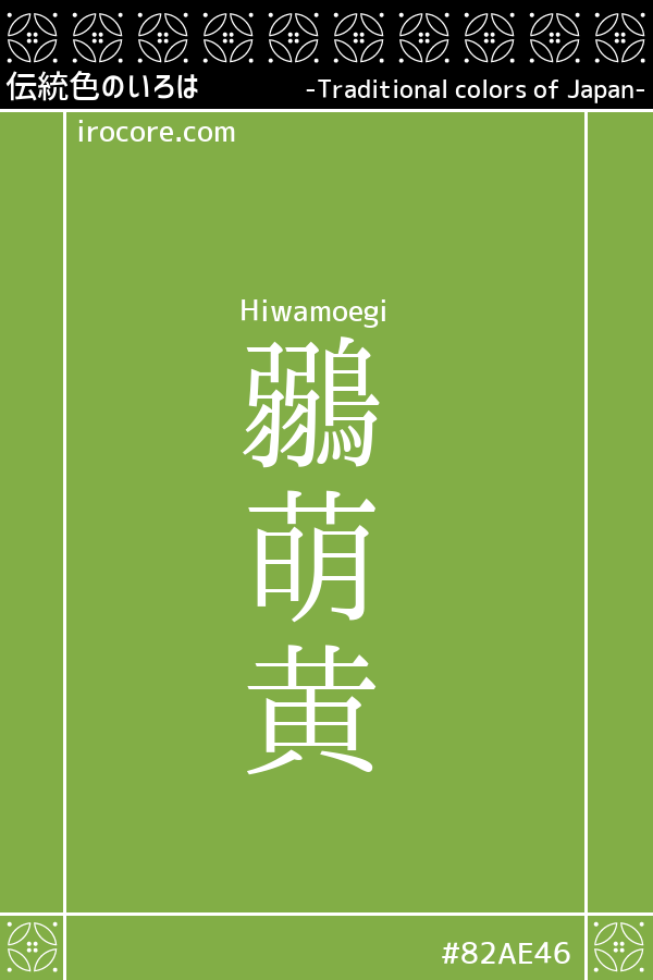 鶸萌黄(ひわもえぎ)とは、鶸色と萌黄色の中間の色で、黄みの強い黄緑色のことです。江戸中期頃に広く用いられており、『手鑑模様節用』に「ひわもえぎ。古名浅みどり」とあるように、江戸期より『浅緑』が鶸萌黄と呼ばれるようになったようです。