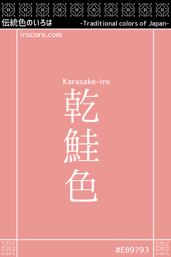 The Karasake-iro, is the pink to orange did not like only the dried salmon. English name is "salmon pink". The color named after the real part of the as dried salmon in the name. There is also a color named "Sakeiro," but, here is the color of the body of raw salmon, it refers to the lighter color than "Inuisakeshoku".