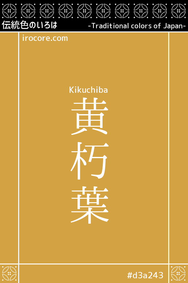 黄朽葉(きくちば)とは、晩秋の黄ばんだ枯れ葉の色を表したような黄褐色のことです。『赤朽葉 』、『青朽葉 』と共に『朽葉色 』の変相色のひとつ。『淡朽葉 』は同色。