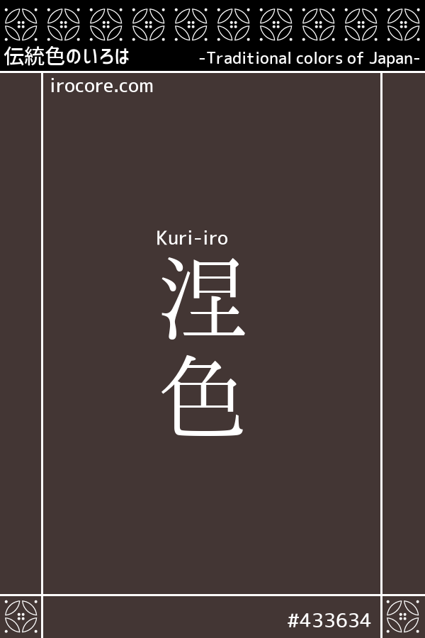 涅色(くりいろ)とは、川底の泥のような茶みがかった黒色のことです。涅 は水の底によどんだ黒い土のことで、平安時代の辞書『和名類聚抄 』にも「涅【久理/くり】水中の黒土なり。」と記されています。