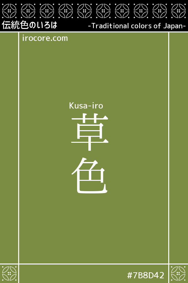 The Kusa-iro, it is a dark yellow-green with dull, such as Little Women became strongly. Fresh "wakakusa-iro" is now darker become and grass green. Is a color name in ancient, color representing the green. Also I will be read as "Soushoku". And as "Kusaba-iro" alias.