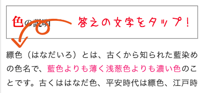縹色のページについたら「色の説明」の「縹色」の文字をタップしてください。次の問題が開きます。