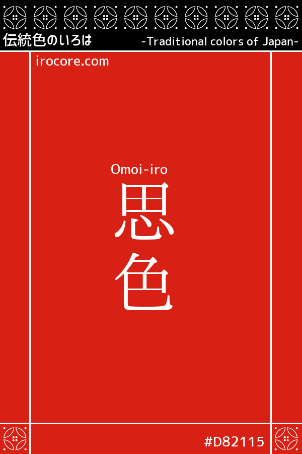 The Omoi-iro is a vivid red color with a slightly yellowish tinge. It is also read as "omoi no iro" and "omohi iro. It is another name for "scarlet hi-iro.