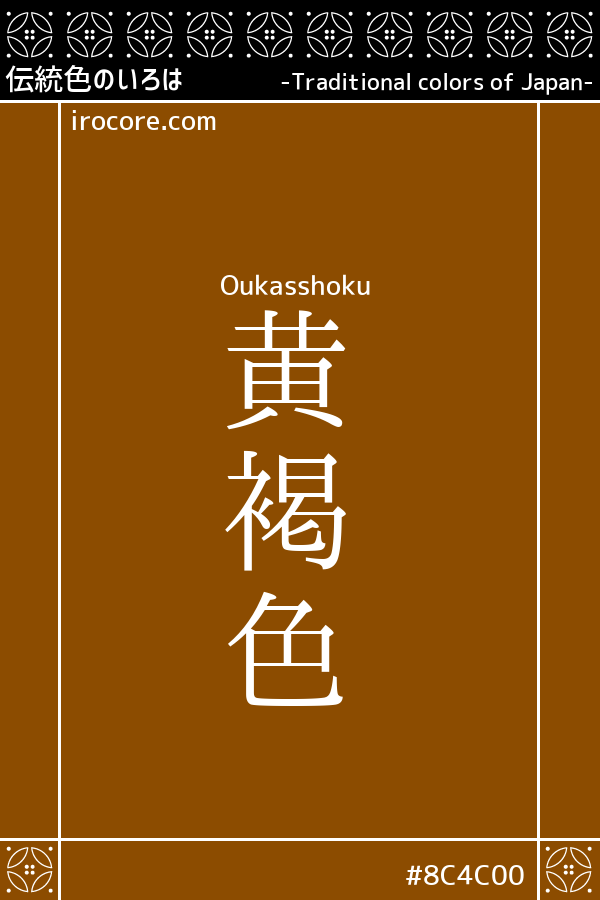 黄褐色(おうかっしょく)とは、暗い橙色 のことです。「褐 」は粗い毛で織った衣服のことで、黒みを帯びた茶色を表します。また別に『きかっしょく』とも読まれます。