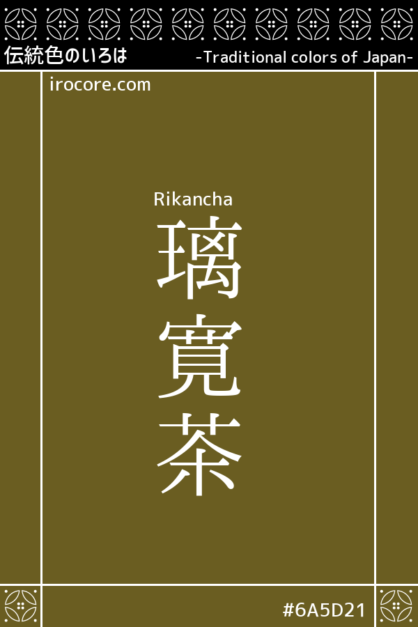 The Rikancha, With brown dark yellowish greenish somewhat, selects a color that was added to the Ai-mi Kobicha. Kabuki actor II Arashi Kichisaburo the time of culture Bunsei of the late Edo period, was popular in Osaka (haiku poet's name: Rikan) in a color that was used in favor, to divide the island popular along with the Shikancha of Sansei Nakamura Shikan, which was popular as well were.