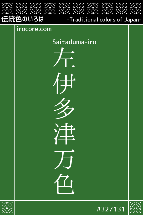左伊多津万色(さいたづまいろ)とは、よく育った虎杖 の葉のような黄みを含んだ濃い緑色のことです。左伊多津万 とは「虎杖」の古名。