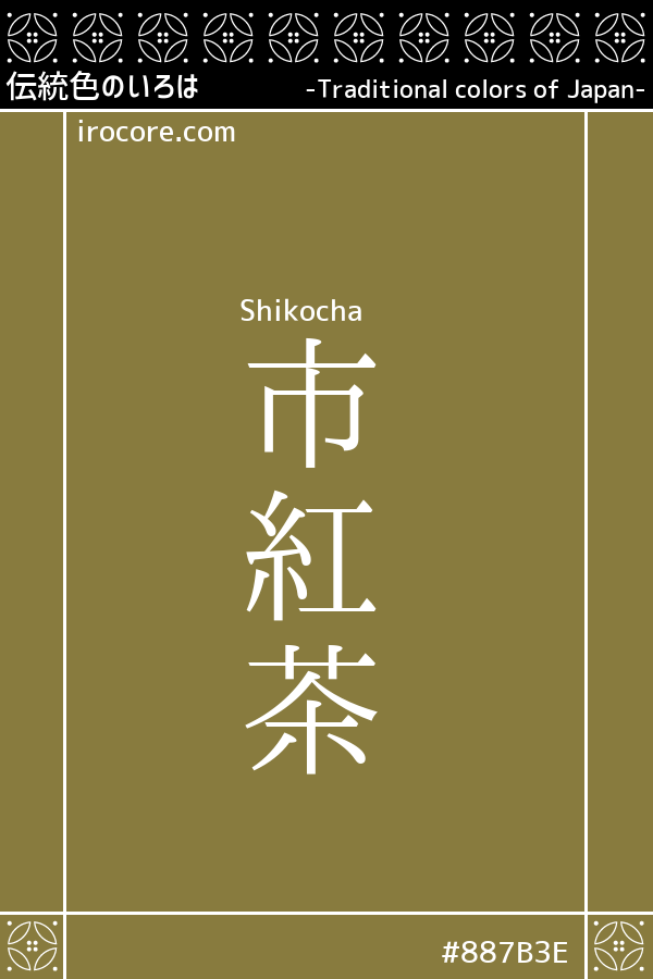 市紅茶(しこうちゃ)とは、媚茶色 より明るい、深く渋い萌黄色 のことです。 色名は江戸後期の歌舞伎役者“市川團蔵 (五代目)”に由来しています。市川團蔵は上方(大阪)時代に“市紅 ”の俳名を名乗っており、その市紅が愛好した色から『市紅茶』と呼ばれるようになりました。