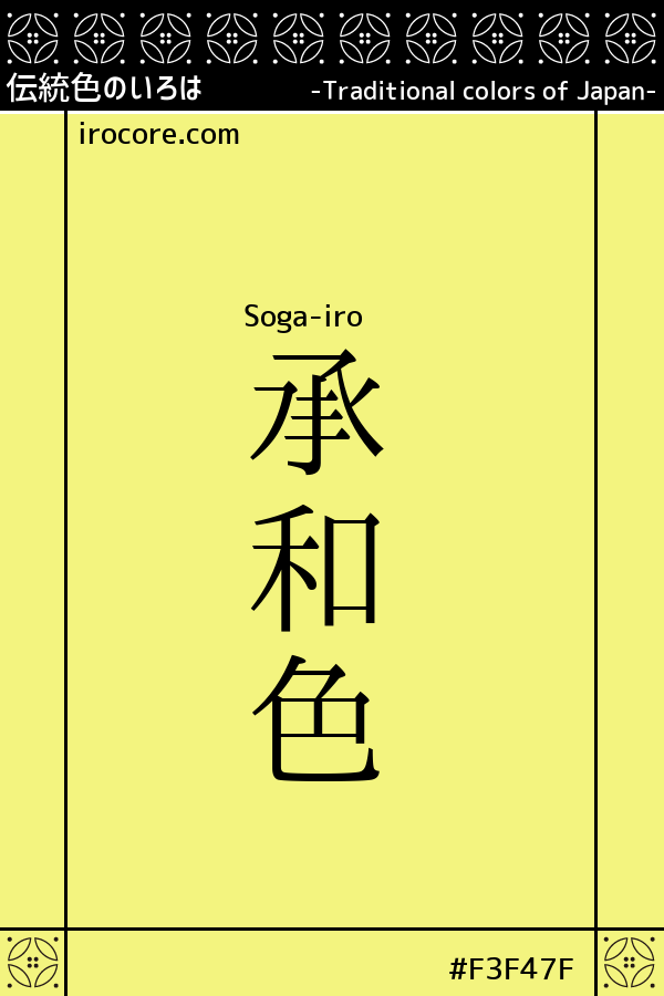 平安時代の承和 年間(八三四〜八四八)、時の帝“仁明天皇 ”が黄色い菊を大変好まれたことにちなんだ色になります。なお「そが」は「じょうわ」から転じた読み方であり、そのまま「じょうわいろ」と読むこともあります。