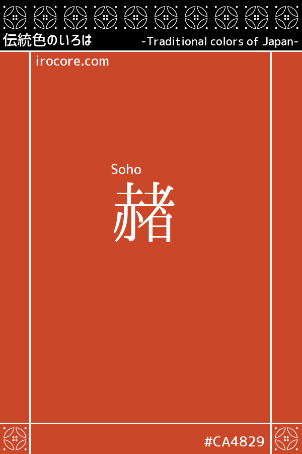The Soho, is a little dark red tinged with yellowish, such as the red clay. A red pigment obtained baked red clay, one of the oldest color seen from the Jomon period. It had been separately, also referred to as "red ocher" and "朱". By the way, "赭土" is itself fittingly, is the red soil.