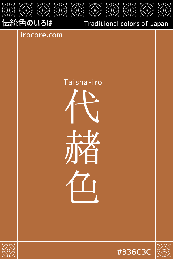 The Taisha-iro, it is similar to the red ocher, yellow or red to brownish. This name now has the good alias as "Sha", from red clay to be produced in China cost the province was famous red soil. It is now also used for dyeing fabric Become a modern.