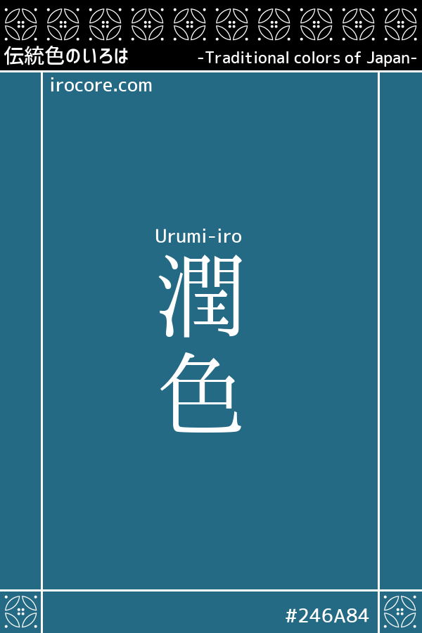 Urumi-iro (潤色) refers to a deep, subdued blue-gray color. The term "urumi (潤み)" means "moisture" or "luster," giving the impression of a slightly glossy yet subdued hue. It is an old color name, recorded as early as 1548 in the Japanese dictionary Unpo Irohajuu (運歩色葉集) from the Muromachi period.
