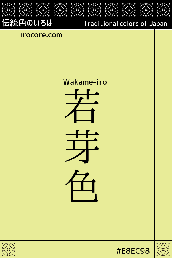 The Wakame-iro, it is a pale yellow-green, such as the young shoots of the plant. Sum to arrive is "Wakaba-iro" "Wakakusa-ro", "Wakana-iro" such as "Waka" the color of the out a recently grass buds grow in color name that has reiterated the "Me" and "Waka" in early spring among the color, it is strikingly color is thin yellow color close.