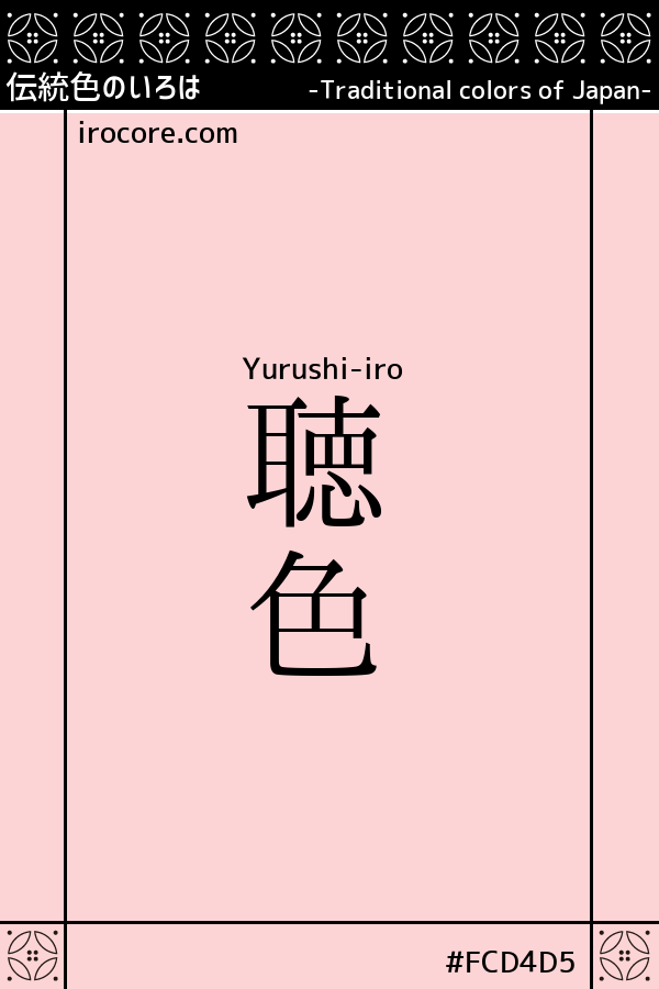 聴色(ゆるしいろ)とは、紅花で染められた淡い紅色のことです。紅花大一斤で絹一疋 が染められた色合いを指し、一般的には『一斤染 』という色名で知られています。『退紅 』と『中紅 』の中間の色。