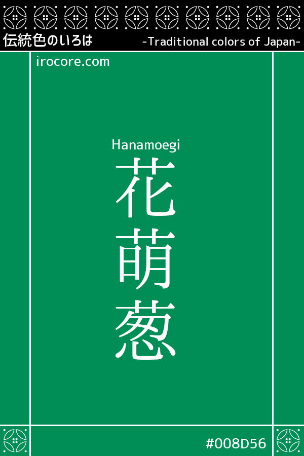 花萌葱(はなもえぎ)とは、若い青ネギの葉のような強く濃い緑色のことです。その名のとおり『萌葱色 』の一種で、青系統の代表的な伝統色である『花色 』に『黄色 』を染め重ねて作られたことから特別に『花萌葱』と呼ばれました。